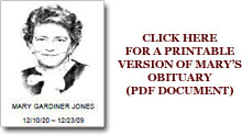 The Jones family roots reach back to the early 1600's in New York and New England. It was their donation of family property which became Long Island's Jones Beach. Mary G. Jones followed the lead of her Aunt "General" Rosalie Jones, the first woman to graduate from the Washington DC College of Law and a well known suffragist, leading marches to Albany and Washington DC starting in 1912. Ms. Jones graduated from Wellesley College in 1943 and worked as an analyst at the Office of Strategic Services, precursor to the CIA. In 1945 she entered Yale Law School, one of two women in her class. She graduated in 1948 Order of the Coif, the high academic honor society of the law profession. She also served as Managing Editor and first woman Board member of the Yale Law Journal. Despite her accomplishments she interviewed with over 50 law firms, many openly refusing to hire a woman, before joining Donovan Leisure as the first woman lawyer in that firm. Work in international trade there eventually led to the start of her public service career when she joined the Antitrust Division of the U.S. Department of Justice in 1953, taking cases on monopolistic practices of IBM and a cartel of Swiss watch companies. In 1961 Ms. Jones joined Webster Sheffield, continuing with her interest in the antitrust arena. In 1964 President Lyndon Johnson appointed Ms. Jones to the Federal Trade Commission where she quickly became involved in the developing consumer movement. She was instrumental in bringing about a stronger consumer voice in FTC deliberations, greater FTC activism on consumer issues and an expanded range of enforcement strategies to correct anti-consumer business practices. Although she left the FTC in 1973, the Agency created the annual Mary Gardiner Jones Award for Volunteerism in 2002, and awarded her the Miles W. Kirkpatrick Award for Lifetime Achievement in 2008, reflecting her public service contributions there and in the intervening years. In 1973 she went to the University of Illinois at Champaign as a professor in the Law and Business Schools, teaching courses in ethics and social responsibility. After two years she returned to Washington DC wanting more direct impact in her areas of interest, though continued to remain active in the educational arena as a Trustee of Wellesley College and Colgate University. She was awarded an Honorary LLD from New York Law School in 1975. In 1975 Ms. Jones joined Western Union as their first woman senior executive. The telecommunication industry was undergoing rapid changes in its technology and regulatory environments and the competitive landscape was shifting. Continuing her efforts on behalf of the consumer, she worked to improve consumer practices at Western Union, but more importantly to bring management recognition that strong consumer focus was of strategic importance. This perspective was increasingly being sought throughout corporate America and during this period Ms. Jones joined the Boards of Safeway, American Airlines, MCA, Alcon Pharmaceuticals and John Wiley Publishing. She also became President of the National Consumer's League, the oldest consumer organization in the Nation. Retiring in 1982, Ms. Jones founded the Consumer Interest Research Institute, a policy think tank and conference organizer which focused on the application of emerging telecommunications technologies to consumer information services and telemedicine health care delivery. This organization was active until 2000. In 1992 at the age of 70 she began graduate study for a PhD in Political Science at Georgetown University, completing course work and comprehensive examination in two years before deciding to focus her energy on volunteer activities in Washington DC and continue consumer advocacy through speeches, articles and conference participation. The last fifteen years of her life were dedicated to the aged, homeless, and inner city children mental health services and issues. Ms. Jones was President and Board member of the DC Mental Health Association and a Board member of the Institutional Review Board of the National Institute of Mental Health. She assumed leadership and support roles in a variety of advocacy coalitions and was actively involved in the National Council on Aging, IONA senior services organization, Washington School of Psychiatry, Older Women's League, Hillcrest Children's Center, and the DC Hurt home for Children. In 2005 she started writing her memoir Tearing Down Walls - A Woman's Triumph, which details both Jones and related family history and her life experiences. It was published in 2007. She is survived by nephews John, David and Charles Watkins and Robert Crooker, great nephews Marc and Christopher Watkins, great nieces Sharon and Kelly Watkins and Hannah Crooker, and great great nephew David Watkins. Ms. Jones will be remembered for her brilliance, hard work and tireless energy, integrity, independence, commitment to Public Service, lifetime pursuit of personal growth, deep devotion to family, the extraordinary breadth of friendships she had, and the many, many people she helped during her life. With a long-standing interest in race relations, Ms. Jones has endowed an ongoing scholarship at Howard University, Washington DC for students who work toward improving Black - White relations. In lieu of flowers or other remembrances, she asked that donations be made to the "Harold O. Lewis Endowed Scholarship Fund". c/o Nesta H. Bernard, Interim Vice President Development & Alumni Relations, 2225 Georgia Avenue, NW, 8th Floor, Washington, DC 20059 A Memorial service is scheduled for 1:00 PM January 4, 2010 at St. Columba's Episcopal Church, 4201 Albemarle St. NW, Washington, DC 20016, with interment in St. John's Memorial Cemetery, Laurel Hollow, NY 12:00 PM January 5, 2010.